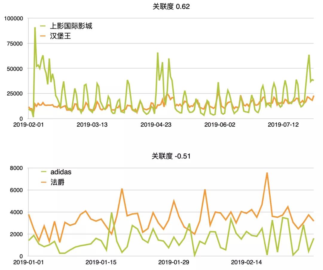 相關(guān)性分析可以在眾多數(shù)據(jù)中找到兩個(gè)不同品牌、樓層的統(tǒng)一性,從而確定兩者是否存在強(qiáng)相關(guān)。舉例來說,可以分析兩個(gè)位置不相關(guān)、品類不相關(guān)的品牌,在銷售周期區(qū)間是否有同樣的銷售波動(dòng)曲線。