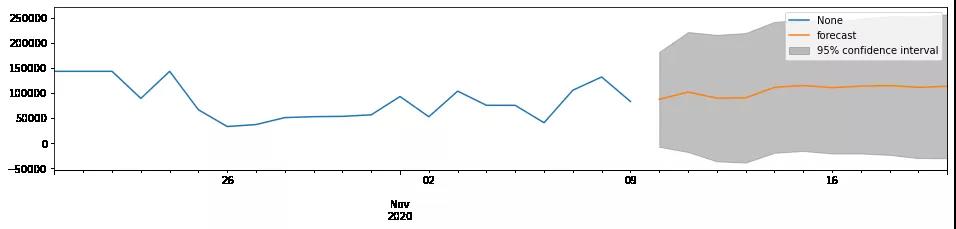 但需要注意,時(shí)間序列模型無法判斷相對于樣本較長期的數(shù)據(jù)預(yù)測,根據(jù)以往經(jīng)驗(yàn),不得超過3倍q值或k值,否則會(huì)導(dǎo)致預(yù)測數(shù)據(jù)平穩(wěn)化,從而失去算法預(yù)測意義。且置信區(qū)間會(huì)隨著預(yù)測周期的延長而變?yōu)槔葼睿A(yù)測方差檢驗(yàn)會(huì)越來越大,也就失去了判斷的標(biāo)準(zhǔn)。實(shí)際經(jīng)營中,交易能力的判斷也許會(huì)影響商業(yè)調(diào)改、經(jīng)營預(yù)警等等經(jīng)營環(huán)節(jié)。