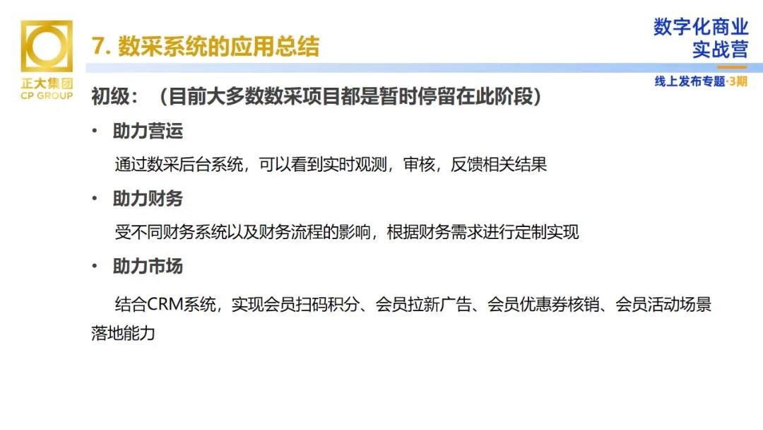 數(shù)采的初級階段作用是指:第一,助力營運(yùn),通過數(shù)采后臺(tái)系統(tǒng),可以看到實(shí)時(shí)觀測,審核、反饋相關(guān)結(jié)果;第二,助力財(cái)務(wù),受不同財(cái)務(wù)系統(tǒng)以及財(cái)務(wù)流程的影響,根據(jù)財(cái)務(wù)需求進(jìn)行定制實(shí)現(xiàn);第三,助力市場,可以結(jié)合CRM系統(tǒng),實(shí)現(xiàn)會(huì)員掃碼積分、會(huì)員拉新廣告、會(huì)員優(yōu)惠券核銷、會(huì)員活動(dòng)場景落地能力。