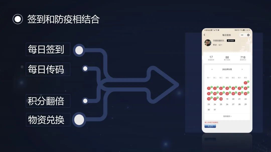 首先,紅星大衛(wèi)茂在會(huì)員系統(tǒng)中做了相應(yīng)的防疫小改動(dòng),新增每日上傳健康碼的功能,連續(xù)上傳積分能產(chǎn)生連擊效果,積分可以兌換防疫基礎(chǔ)物資,這項(xiàng)改動(dòng)也得到了當(dāng)?shù)赜嘘P(guān)部門的認(rèn)可和支持,在地方項(xiàng)目上被評(píng)為防疫先進(jìn)集體。