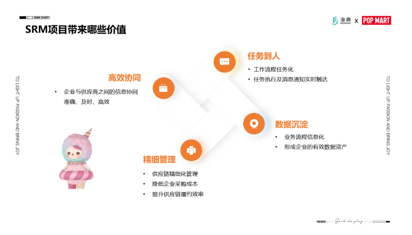 我們基于泡泡瑪特的需求,做了一些定制化的開發。SRM和H6相當于海鼎的兩個平行產品,我們基于我們的業務特性,把這張圖里邊列的一些關鍵場景在我們體系里面做一些實施。
